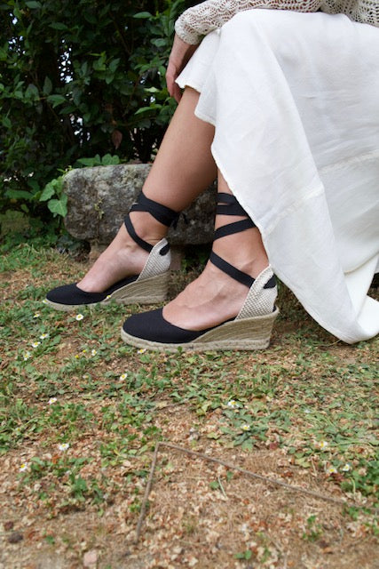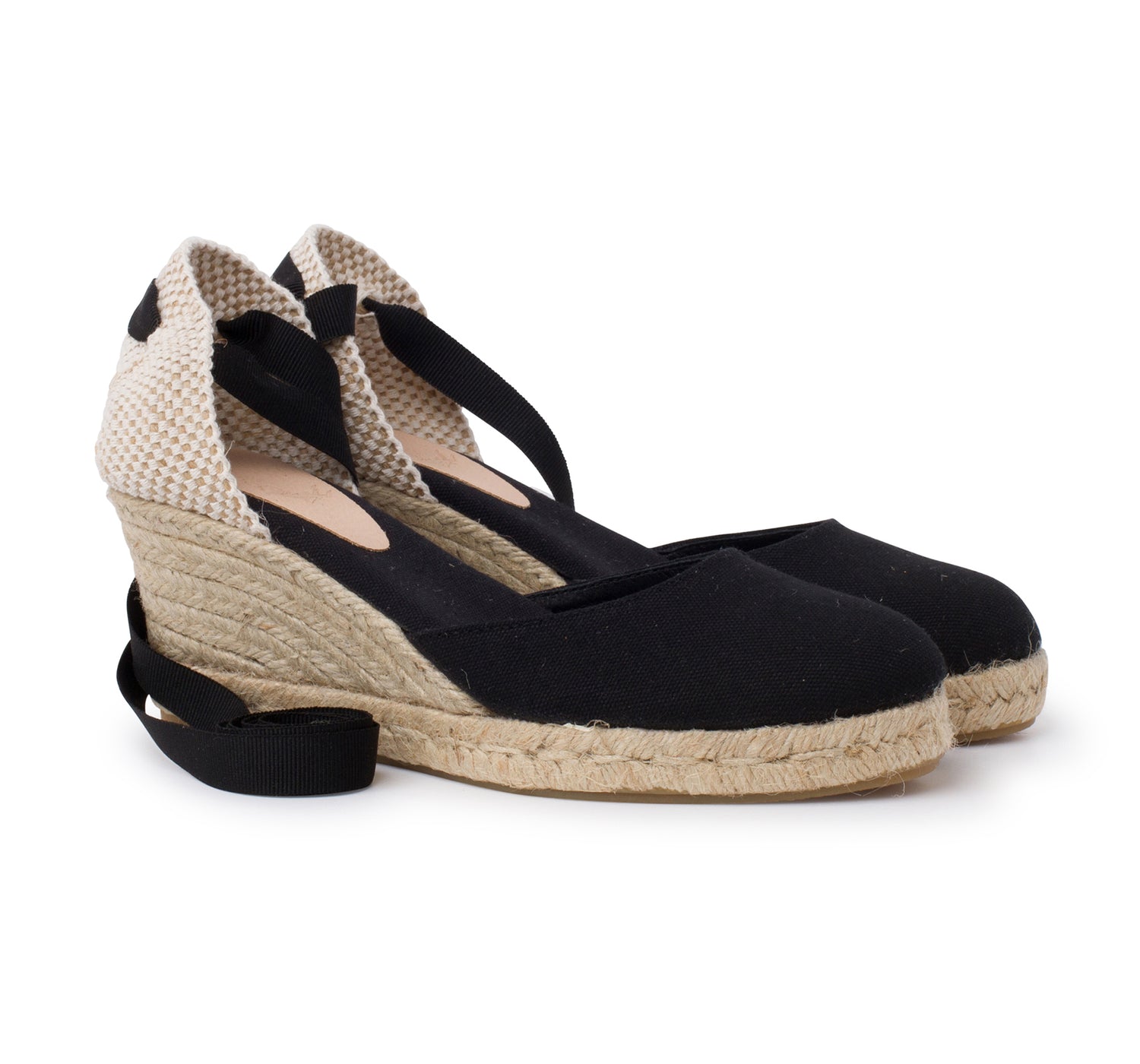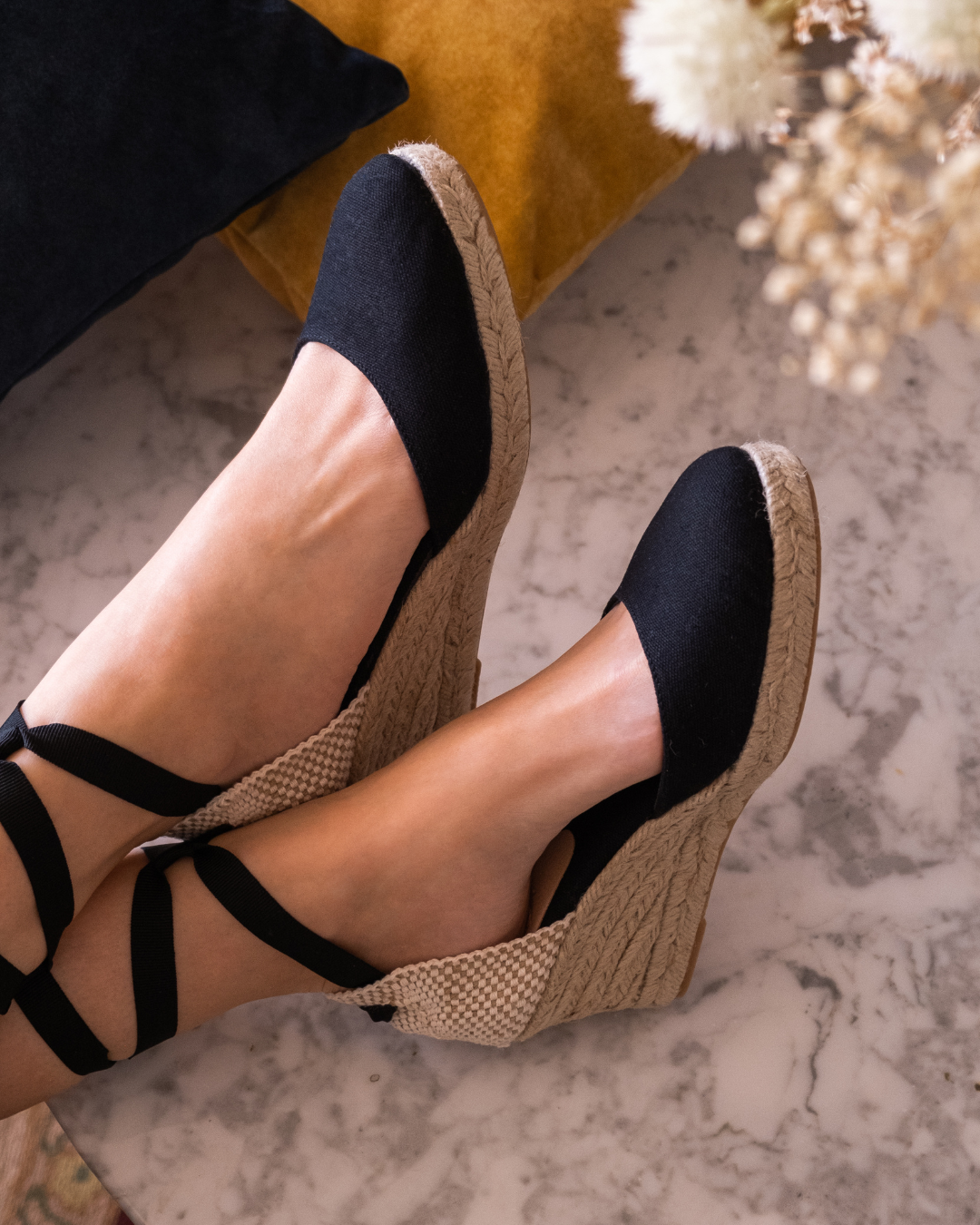 - La estructura de la cuña, elaborada en lona de algodón, con talonera en tejido trenzado y cierre al tono con lazo al tobillo, hacen que Zanzíbar sea todo un clásico: elegante y cómodo
