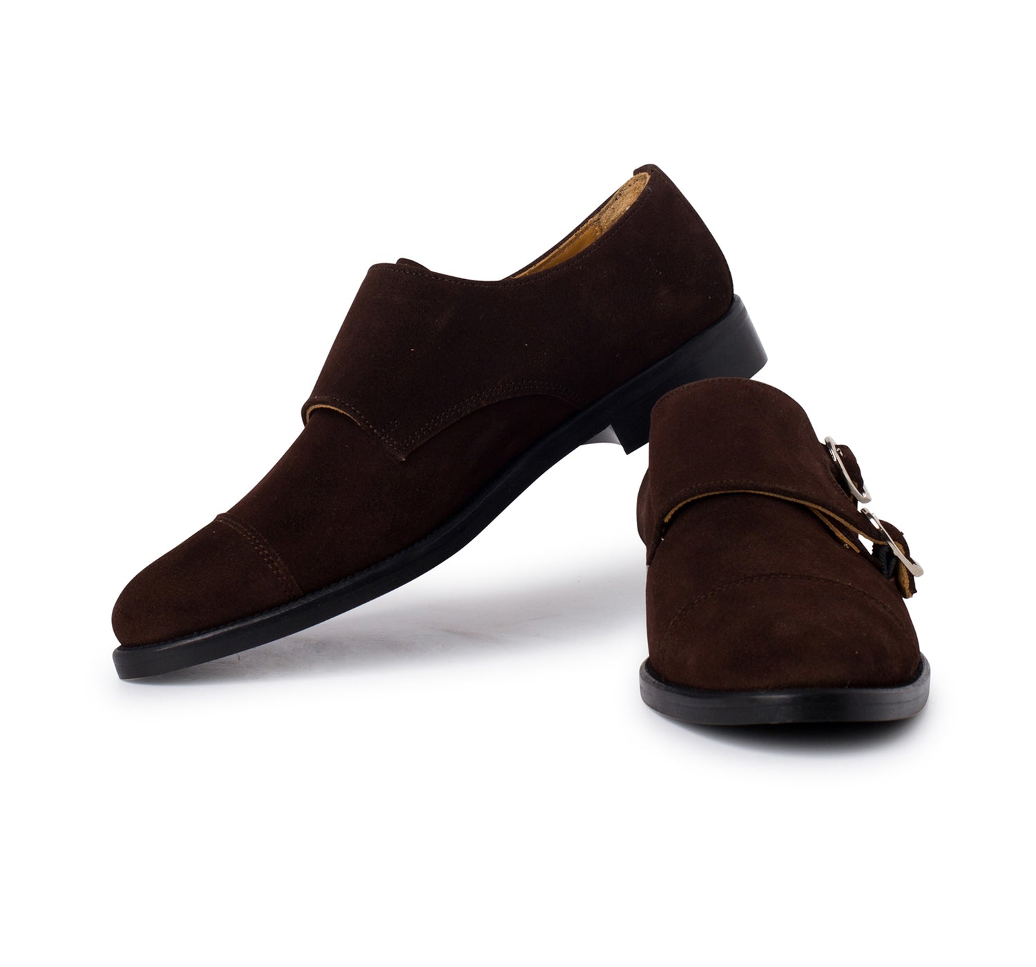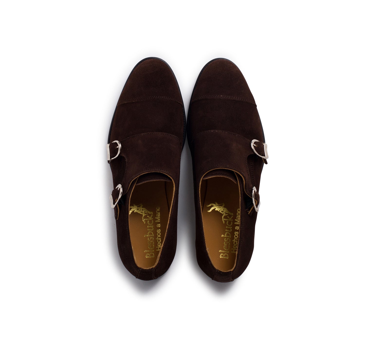 Zapato de doble hebilla de puntera recta en serraje marrón liso.