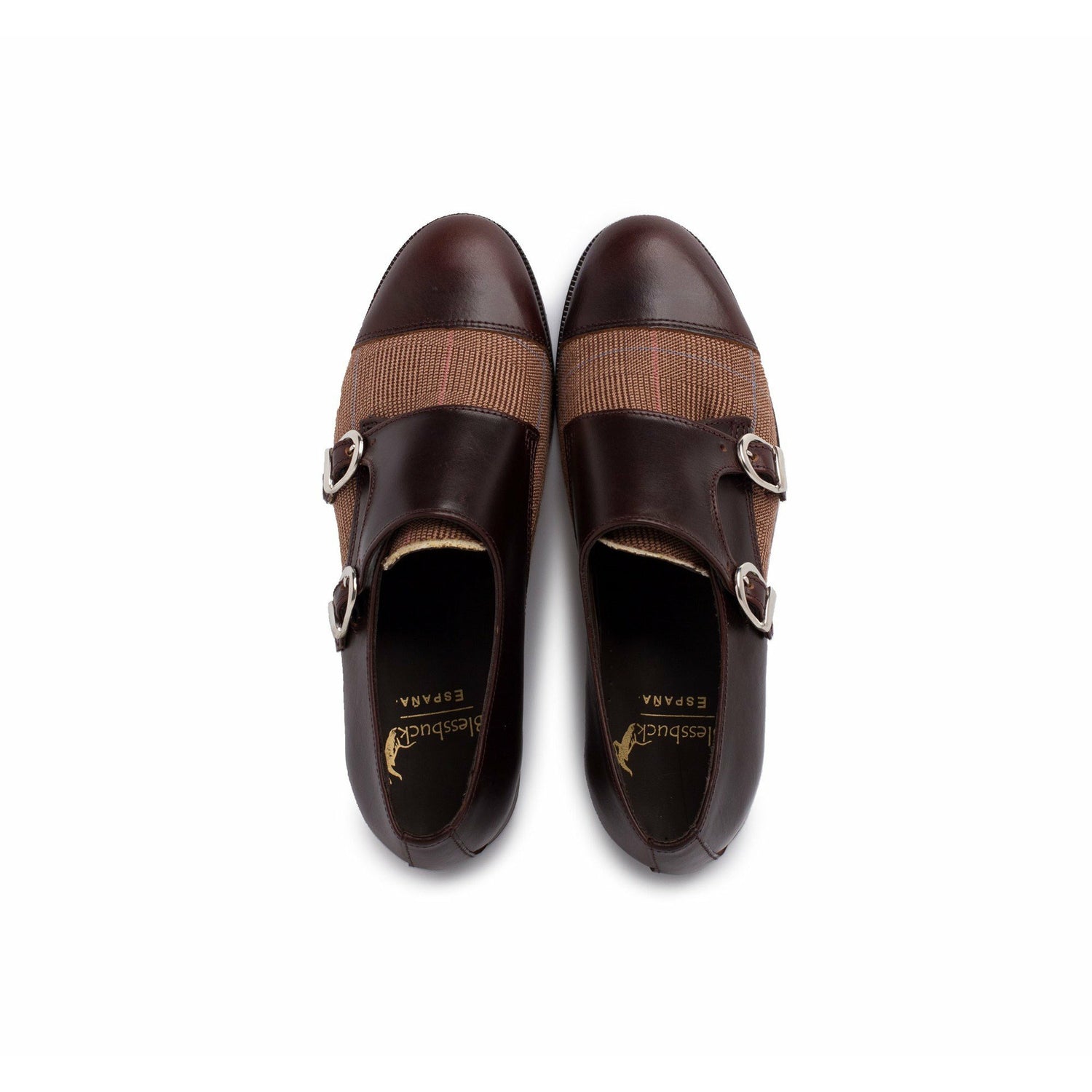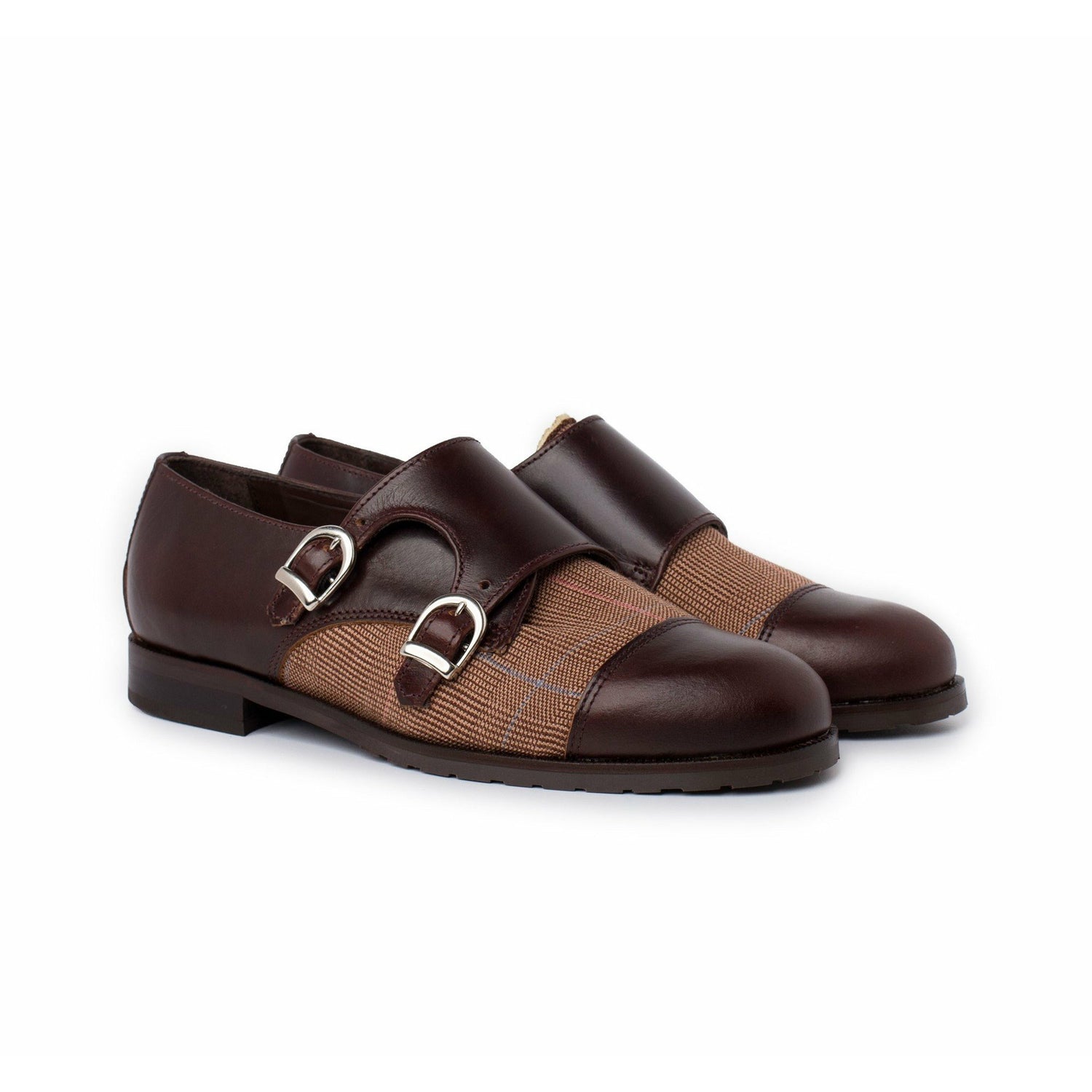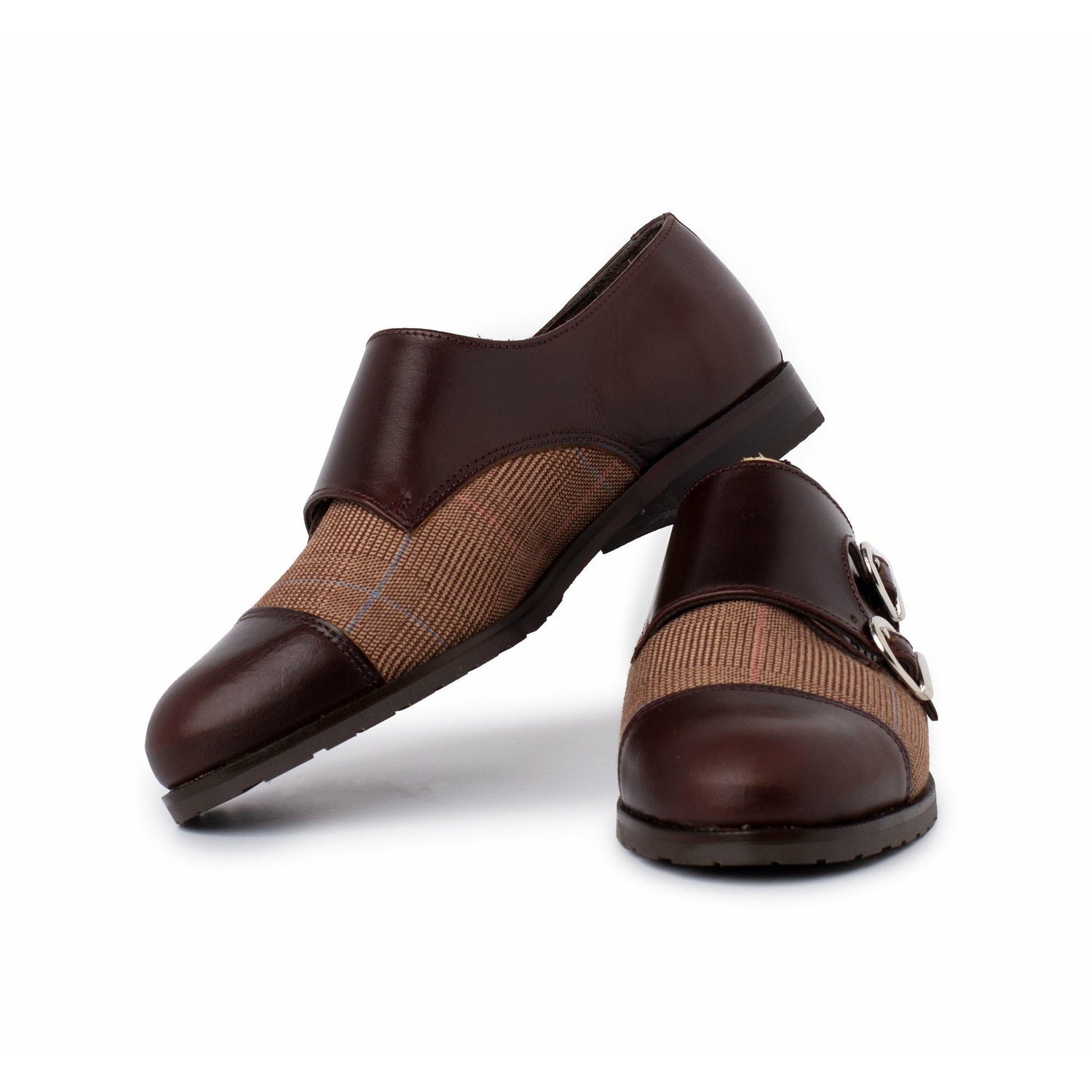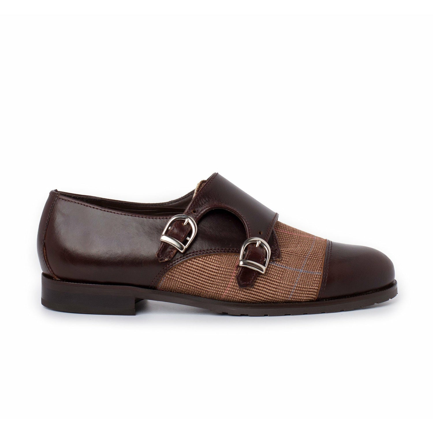 Zapato de doble hebilla de puntera recta que combina piezas en pull* marrón y tejido príncipe de Gales.